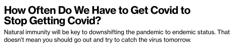 And here we are all this time later and top headlines are finally admitting what should have been obvious from the beginning. For a virus this prevalent, it ends with widespread natural immunity. Here’s the Bloomberg headline: