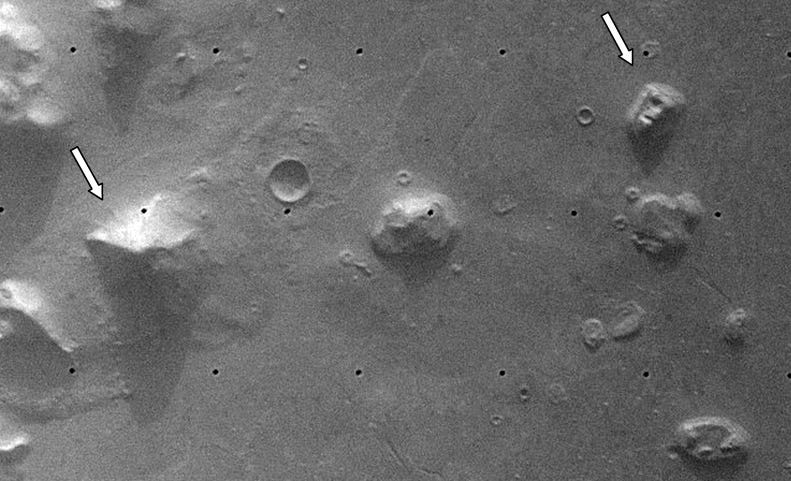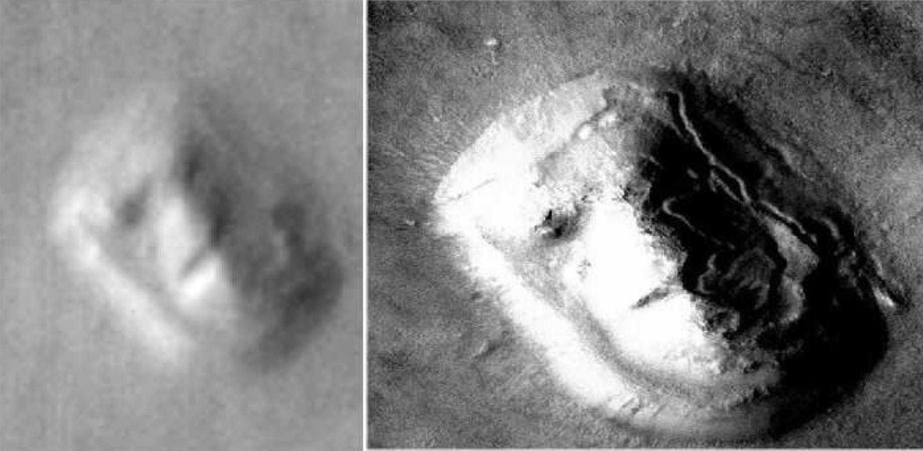 The image below was acquired by the Mars Global Surveyor (MGS) in 1998, and it made the issue of facial features more or less moot. Prior to this, NASA spent a long time ridiculing the idea that the structure on Mars could indeed be an artificially made face, and claimed that the pyramids were nothing more than natural formations.