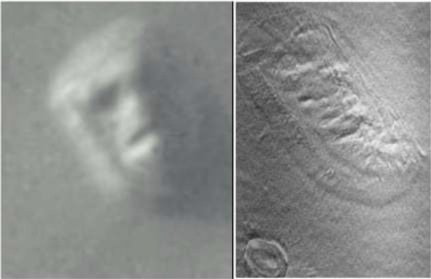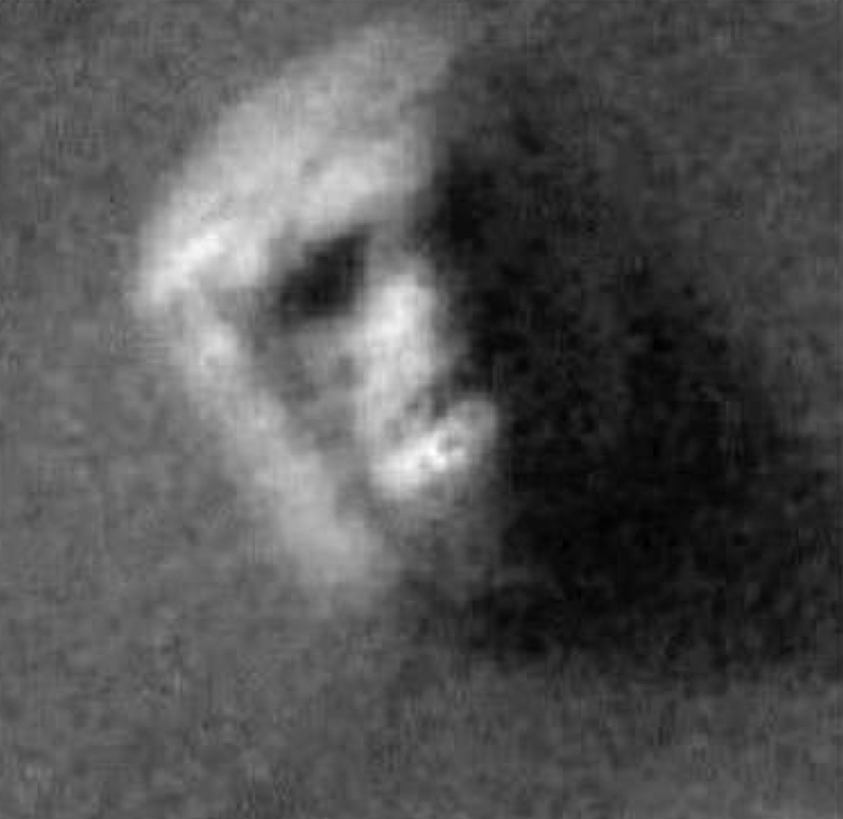 The original images, upon enhancement, also appeared to show teeth like structures in the mouth, as pointed out in the image below. This analysis and image enhancement (below) comes from Mark Carlotto, a renowned image analysis expert who works in the aerospace industry. He published it, and others, in Applied Optics in 1988. According to him,