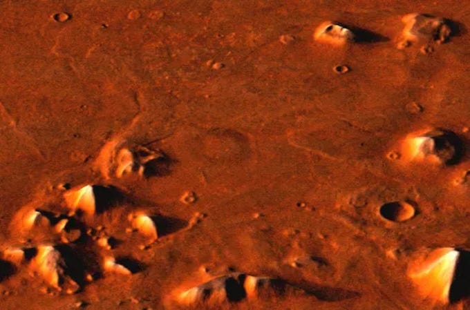 What makes the artificially constructed theory more plausible is the fact that it’s not alone. Nearby are other strange looking objects, some quite geometrical in shape. A number of them look like pyramids, one apparently five-sided. Moreover, the objects seem to be arranged on the Martian surface in an organized pattern with precision.