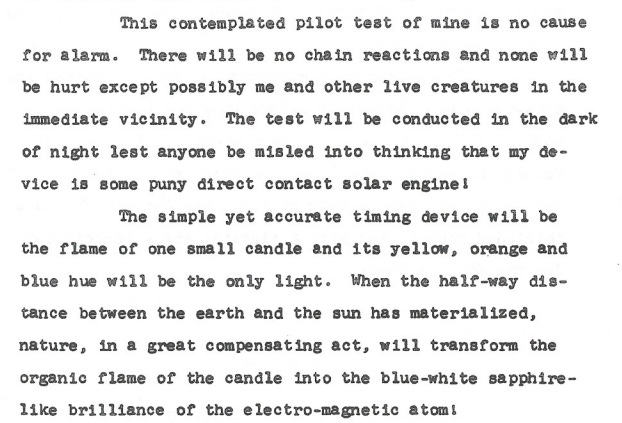 Prior to the interview with Nebel, Carr actually wrote a book called “Dimensions of Mystery.” The book was mostly written in ‘code.’ According to Carr, it was the complete layout of his plan and how his machine worked, yet for a reader like me, or anyone for that matter, it’s impossible to understand. He did switch from user code and poetry, to actually writing real statements regarding his intentions for a public demonstration, as you can see below: