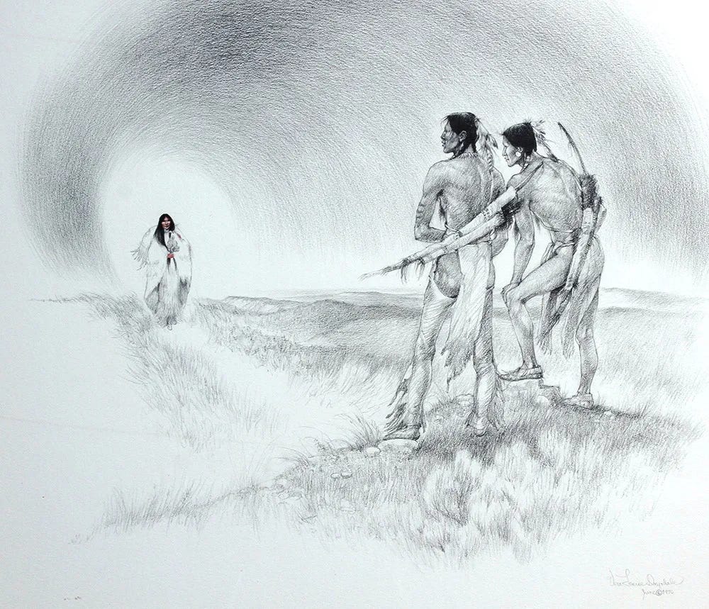 The story goes that she appeared in front of two warriors who were out hunting buffalo in the sacred Black Hills of South Dakota. They saw a large body coming toward them, and as it came close enough it was seen as a white buffalo calf. As it came even closer, it shape-shifted into a young Indian woman.