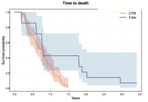 The increase in median survival time is just a few months and not statistically significant. But the average survival time of the folate-treated group was more than double, and the difference was statistically significant (by my calculation, not in the article).