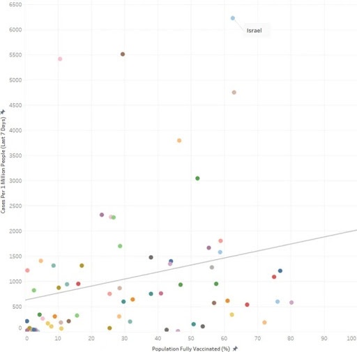But the data in the paper don’t show that vaccination and spread of COVID-19 are “unrelated.” In fact, there is a paradoxical relationship, an insidious relationship: The more vaccinated countries had more new COVID-19 cases (during the week when the survey was conducted). The correlation is significant (p=0.04).