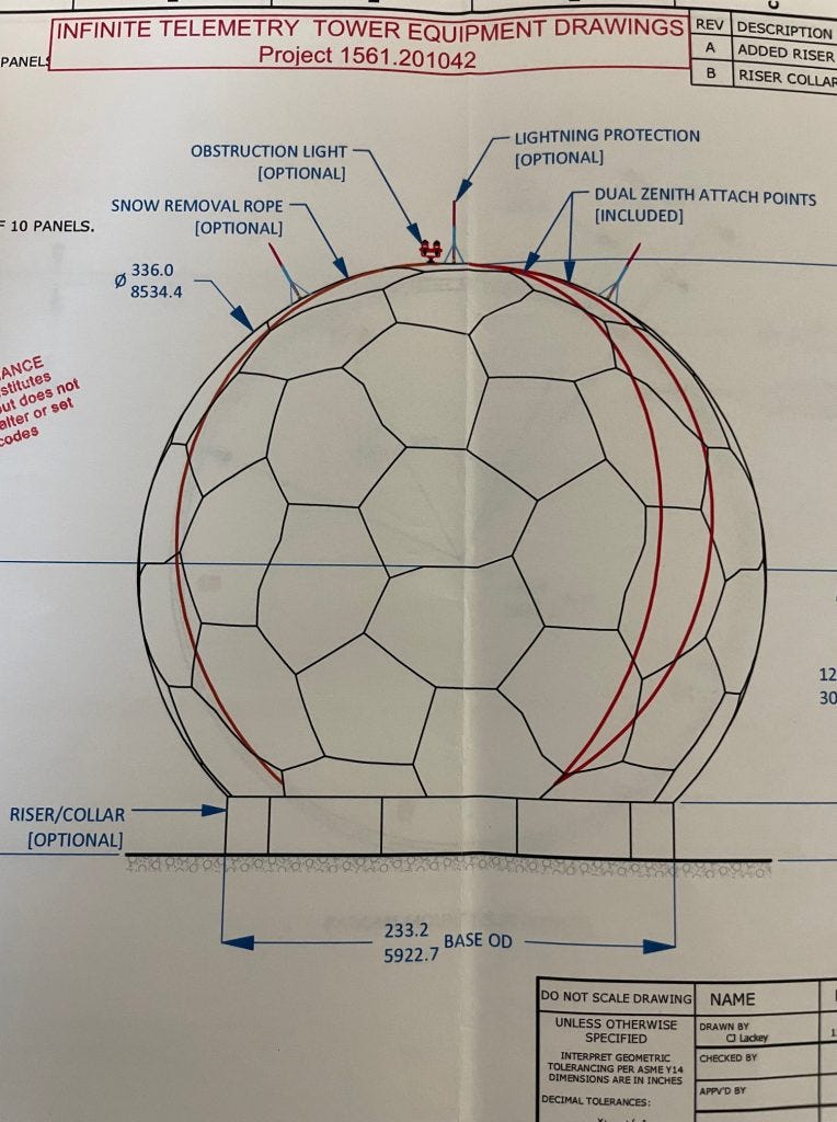 The location is made up of multiple structures, including a 100-foot tall tower with a radar dome, two 50-foot collapsible auxiliary towers, and an elevated monitoring facility with an observation deck.