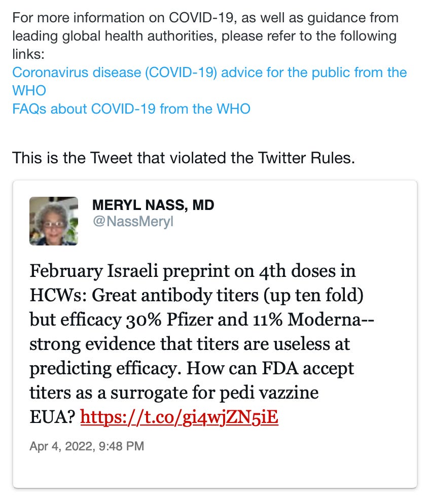 But Berenson is not the only person who Twitter censored for writing about science that is inconvenient for the biopharmaceutical industry. Earlier this April, Twitter cancelled physician Dr. Meryl Nass for tweeting the conclusions from the preprint of a clinical trial by Israeli scientists (the NEJM later published the preprint as a letter.)