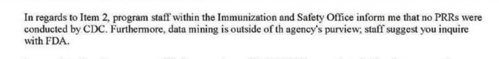But did any reporter follow up on the government’s promise to examine VAERS? It doesn’t appear so. That task was left to Children’s Health Defense which filed a FOIA asking to see evidence that the agencies analyzed the VAERS database. Oddly enough, when they asked for documents to explain how the CDC performed the promised PRR data mining on a weekly basis, here’s the CDC response: