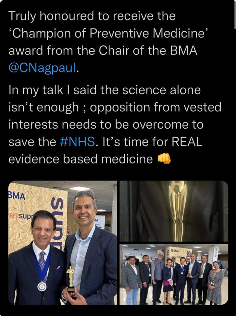 Running around with their hair on fire, several prominent physicians began texting Malhotra to take down his tweet, which he then did. The grave concern was that some on Twitter were linking Malhotra’s talk that was NOT a BMA talk, with Malhotra’s award that was NOT a BMA award.