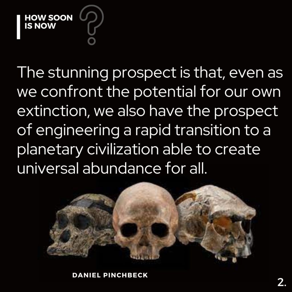 In How Soon Is Now (2016), I attempted to zoom as far out as possible to devise a vision and an action plan for humanity’s future. Writing it, I sometimes imagined myself as a long-living extraterrestrial, observing the Earth for millennia from some nearby planet. From where we are, immersed in rapid-fire events, our world seems chaotic, cacophonous. We lurch from crisis to crisis with no end in sight. Many people feel we are inexorably heading toward civilizational collapse or even extinction. Certainly, anything is possible.