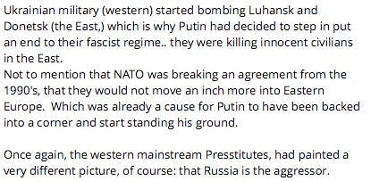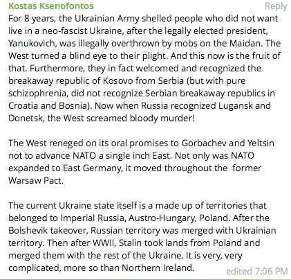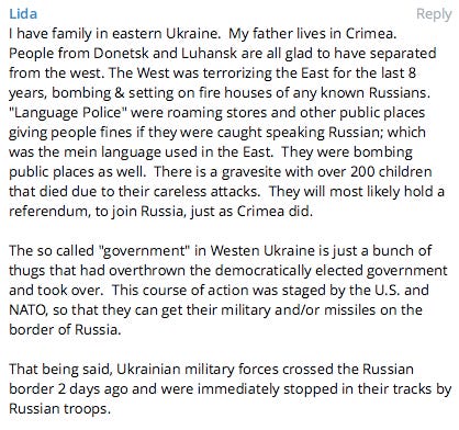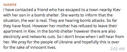 "I live near a town heavily populated by Ukrainians. Many still have family living there. Here's a copy and paste of a message from one of my friends there: