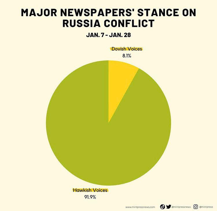 According to them, ninety percent of recent articles in the New York Times, The Washington Post and the Wall Street Journal have taken a hawkish view on conflict, with not many anti-war voices receiving attention. Right now, mainstream media is unified 100 percent with regards to who the aggressor is in this situation; Russia. Anybody who questions this narrative, according to legacy media, is insane. Where have we seen this before?