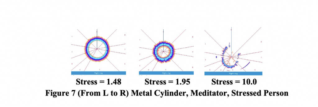 The second device which goes by the name Bio-Well, operates on the Gas Discharge Visualization (GDV) principle. It estimates our light characteristics by applying a harmless electric current to the ring fingers of both hands, one at a time. The finger’s response to the electrical stimulus is a burst of photons that are captured and analyzed with software to estimate a stress parameter and energy, J. These parameters directly correlate to stress and emotions. See this short video clip showing how the measurement is made. Figure 7 depicts the photonic images of a metal cylinder which is unaffected by external conditions, a long-time meditator, and a highly stressed individual.