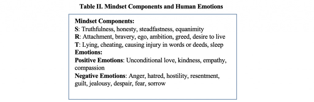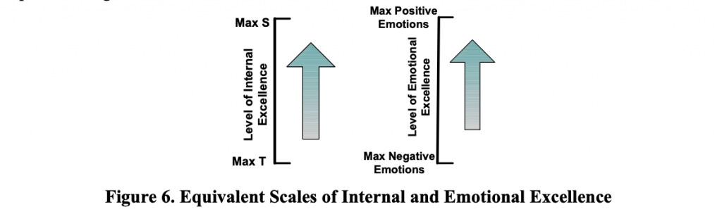 Human beings are endowed with two types of emotions: Positive emotions and negative emotions defined in Table II. The two emotions are correlated with the three mindset components. Positive emotions are strongly and positively correlated with the S component while negative emotions are strongly and positively correlated with excessive R and T components. The specific proportions of these components determine the level of internal excellence of an individual. These ideas are depicted in Figure 6.