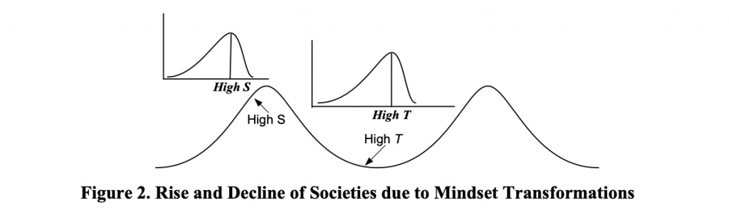 As the average S component of a society rises, the society rises, but the S component cannot increase indefinitely, and when it reaches its peak, the T component takes over, and the society begins to decline. The average T component cannot decline indefinitely either, and when it reaches its peak, the S component takes over and the society begins to rise again. These mindset transformations lead to repeated rise and fall of societies as depicted in Figure 2. History records the inevitability of the rise and decline of societies. Ancient civilizations such as Egypt, China and India, and not so ancient cultures such as Greece and the Roman Empire are all examples of societies that dominated the world at one time only to eventually decline with the passage of time.