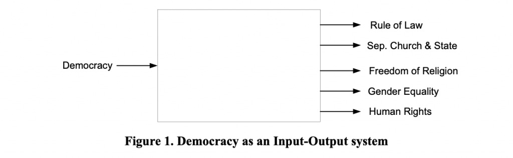 To elaborate, Figure 1 depicts democracy as an input-output system. Several illustrative outcomes indicative of what is expected from a democracy are shown in Figure 1.