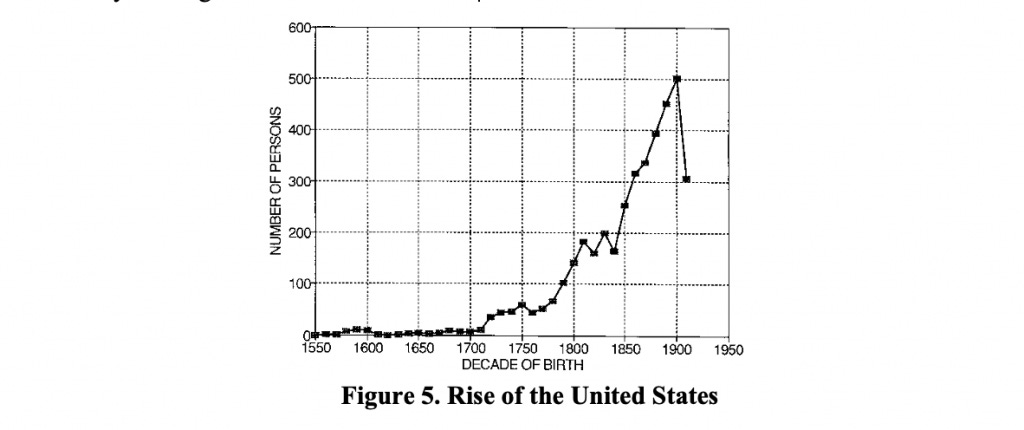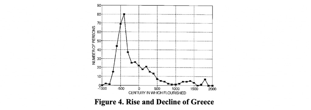 To corroborate these ideas, we examined the data in all 23 volumes of the 1991 edition of the Encyclopedia Britannica in the early nineties to see if they offered any clues on the rise and fall of societies. We studied Greece, Great Britain, Germany and the United States. The data for Greece are shown in Figure 4. This figure depicts the number of individuals born in Greece listed in all the twenty-three volumes of the reputed reference. The nation that gave birth to giants like Aristotle, Plato, Socrates, Archimedes and Homer is today counted as the weakest link in the European Union. I have taught a six sigma class for the MBA students of the University of Kentucky in Athens, Greece for twelve years and the students were in agreement on my findings about their nation.