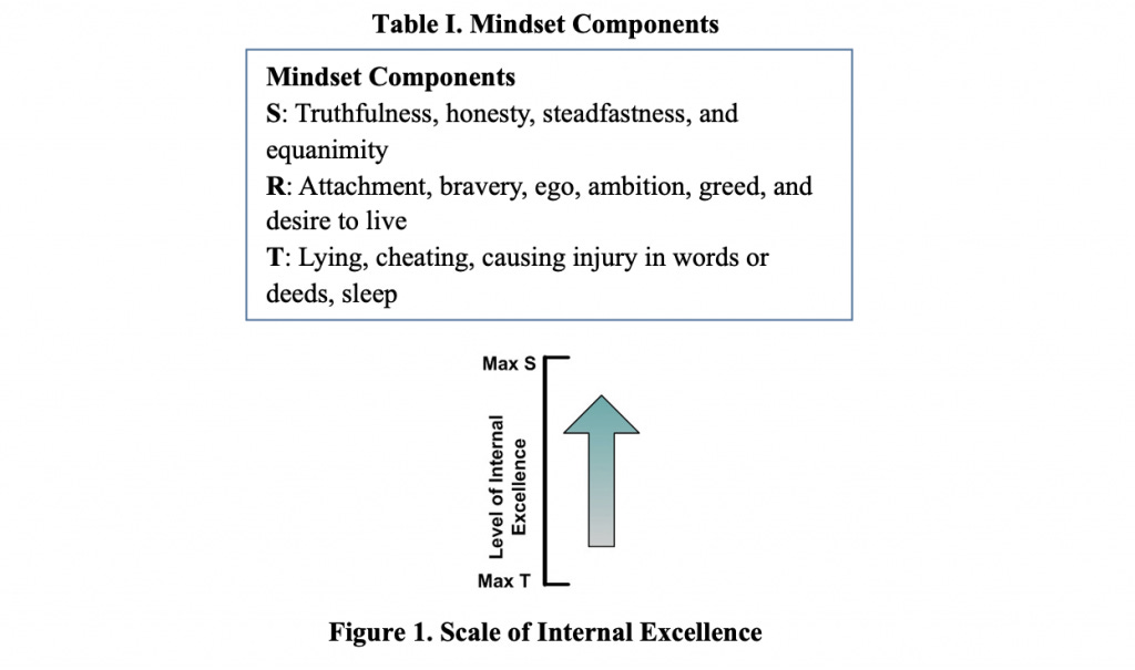 We, the 7½ billion human inhabitants of planet Earth, have three components of the mindset denoted by the letters, S, R, and T. They are defined in Table I. Figure 1 depicts the scale of internal excellence. The noble ones among us are towards the top-end of the scale while the wicked ones towards the bottom and the rest of us somewhere in between.