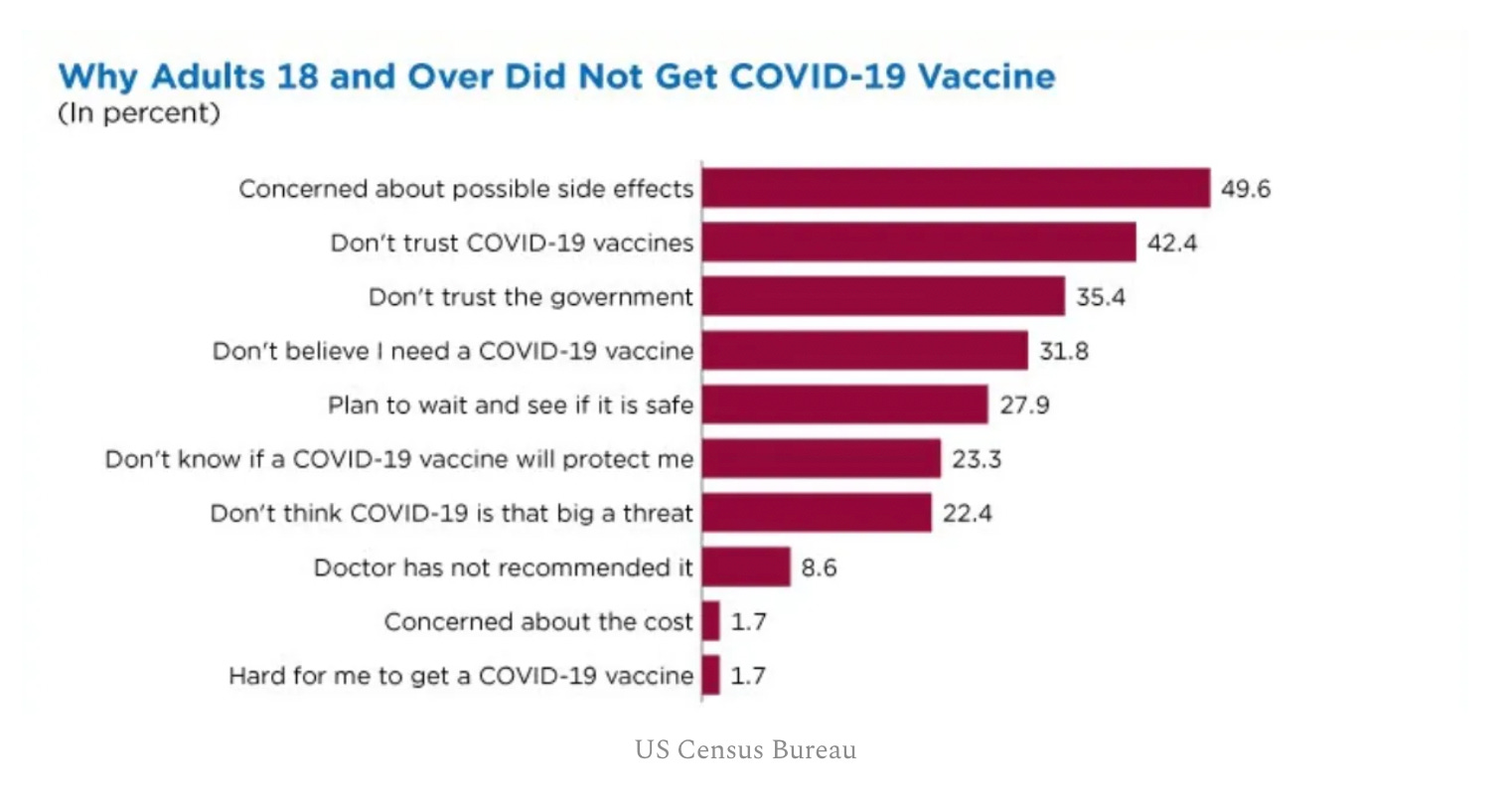 This is why it is no surprise that a report from the US Census Bureau revealed the following results when it came to why people over 18 in the US chose not to get vaccinated.