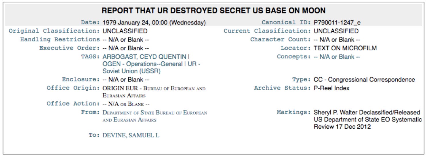 Without speculating here, we can conclude that this is what it says it is, a report regarding possible space wars that are taking place in the classified world. The document title alone not only exposes the reality of these alleged wars, but the possibility of a "Secret Moon Base" belonging to the United States that apparently was in operation until it was destroyed by "UR." (Soviet Union)