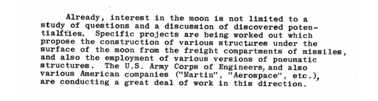 It is not out of the question that artifacts of these visits still exist, or even that some kind of base is maintained (possibly automatically) within the solar system to provide continuity for successive expeditions. Because of weathering and the possibility of detection and interference by the inhabitants of the Earth, it would be preferable not to erect such a base on the Earth’s surface. The Moon seems one reasonable alternative. Forthcoming high resolution photographic reconnaissance of the Moon from space vehicles – particularly of the back side – might bear these possibilities in mind. (source)