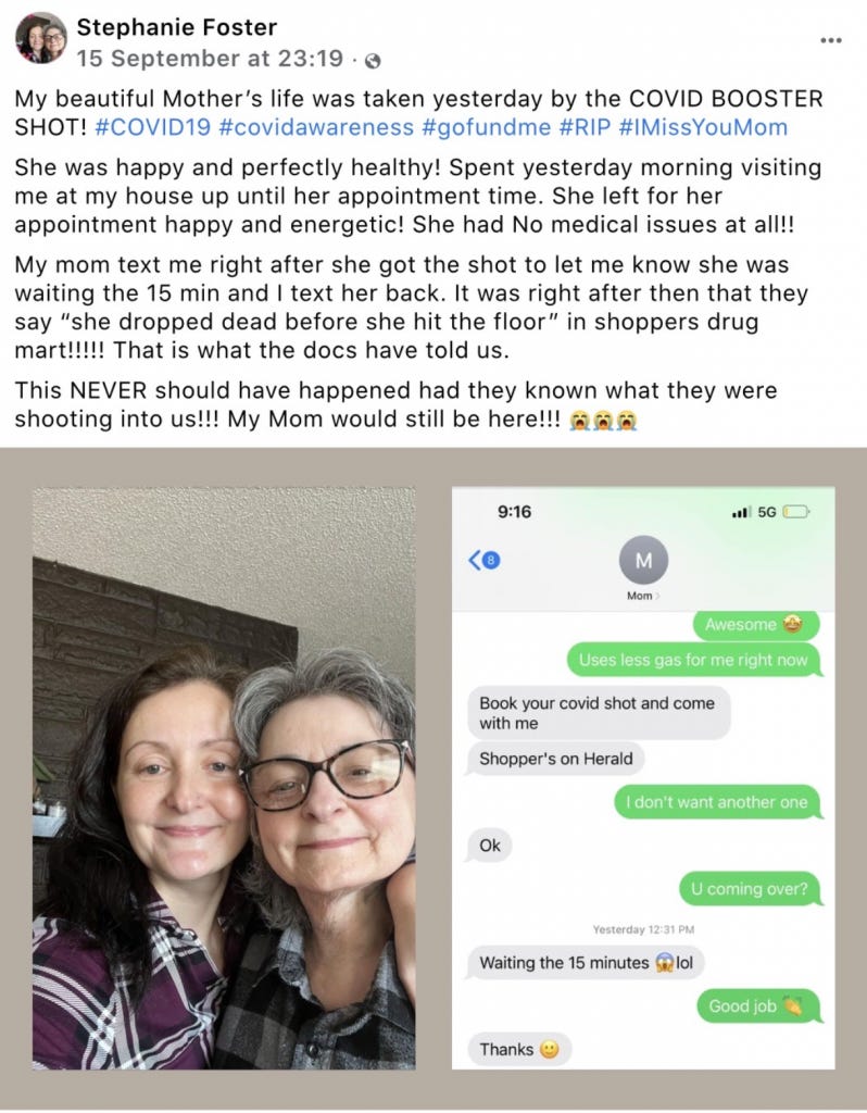 “I do not believe this was caused from natural causes. My Mom had no health conditions. I believe had she not gotten that Covid shot then she would be here with us today!"